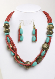 This red beads multi strip  turquoise stone and metal beads is vibrant and beautiful . Necklace 22" long. Earring 2.5" drop. Made in India